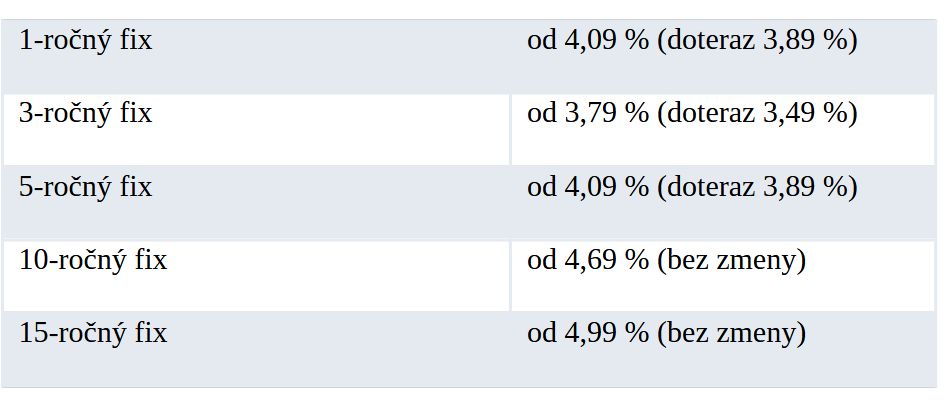 Slovenská sporiteľňa upravuje sadzby jednoročnej, trojročnej a päťročnej fixácie úverov na bývanie. Desaťročná a päťnásťročná zostávajú na rovnakej úrovni. Banka zároveň zvyšuje úroky na termínovaných vkladoch až do výšky 2,60 % ročne pri trojročnej viazanosti.