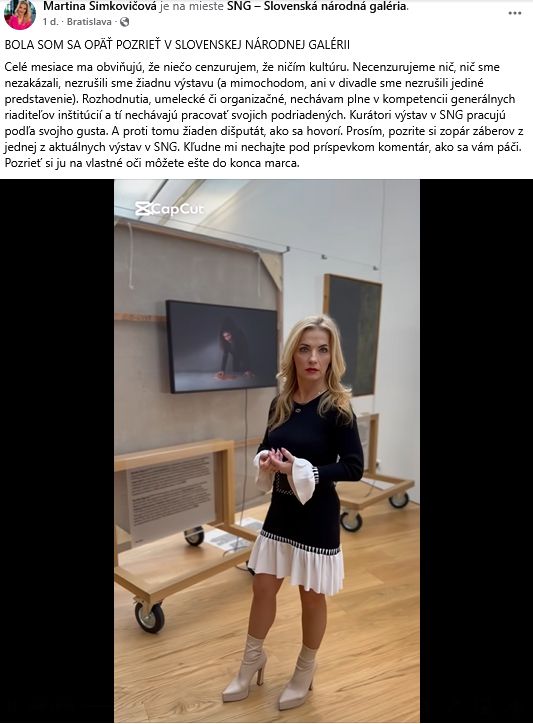 "Z videa je jasné, že Šimkovičová vôbec netuší, kde sa ocitla a svojim statusom vyzýva ľudí na sociálnych sieťach k lynču umeleckých diel, ich autorov, ako aj autorov samotnej expozície. Podprahovo podsúva divákovi svoj názor, pretože veľmi dobre vie, že sa nemôže na kameru vyjadriť priamo, ale robí to spôsobom o to zákernejším. Výstavu si môžu návštevníci pozrieť „na vlastné oči do konca marca“, ako hovorí vo videu Šimkovičová, sama tak stanovila termín ukončenia dlhodobej expozície," píše v stanovisku VŠVU, v ktorom prirovnali praktiky Šimkovičovej a jej ľudí k praktikám nacistov.