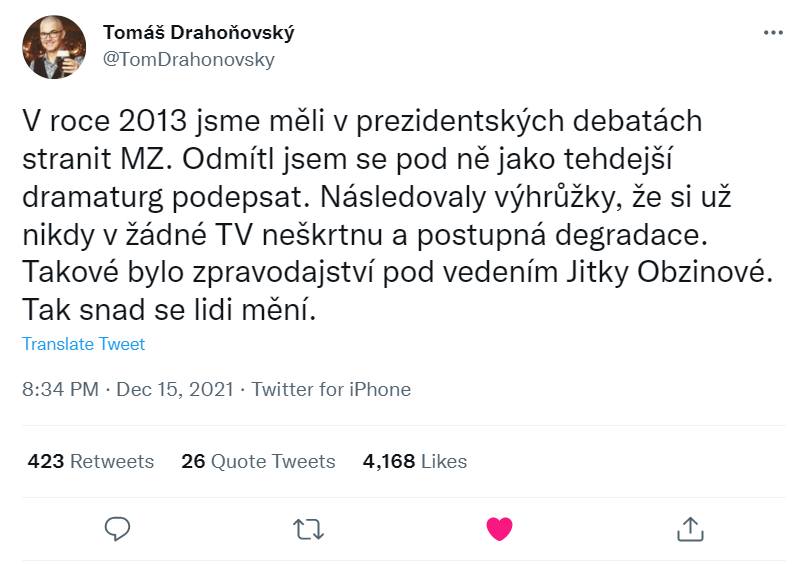 Jitka Obzinová v minulosti pôsobila aj vo vedení televízie JOJ ako riaditeľka výroby. "Som presvedčený, že pani Obzinová nakoniec nájde spoločnú reč so svojimi kolegami vo vedení spravodajstva aj so zamestnancami. Myslím si, že reakcie na jej vymenovanie sú prehnané, aj keď ich rešpektujem," povedal HN. Podľa neho je za Obzinovou veľa pracovných úspechov a nemožno človeka posudzovať podľa jednej chyby, ktorú v živote urobil.