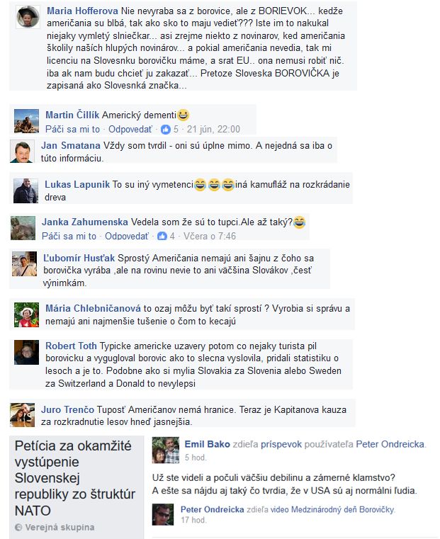 Faceboková stránka s názvom Medzinárodný deň borovičky (MĎB 2017) zverejnila video s komentárom: „Toto ste už videli?!! Borovička v amerických správach. Oni si fakt myslia, že borovičku vyrábame z borovice?"