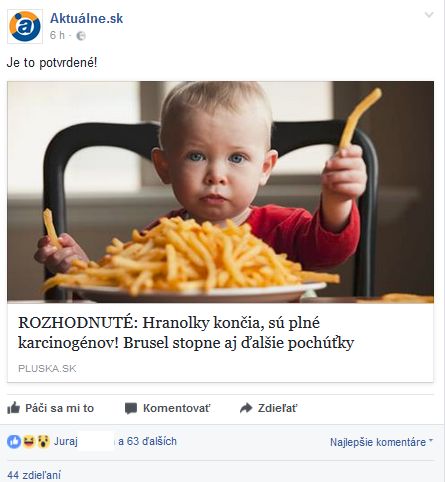 V šírení paniky a hoaxov za Hlavnými správami nezaostáva ani web denníka Plus jeden deň pluska.sk, ktorý dnes zverejnil článok s nepravdivým titulkom: „ROZHODNUTÉ: Hranolky končia, sú plné karcinogénov! Brusel stopne aj ďalšie pochúťky." Web nezabudol na výkričník ani zvýraznené slovíčko ROZHODNUTÉ.