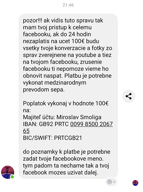 Polícia dnes upozornila, že niektorým užívateľom facebooku prišla správa, ktorej autor sa vyhráža, že sa dostal na ich účtu na facebooku, vie si stiahnuť celý obsah a žiada 100 €, ak ich dostane, ich účet nechá tak.