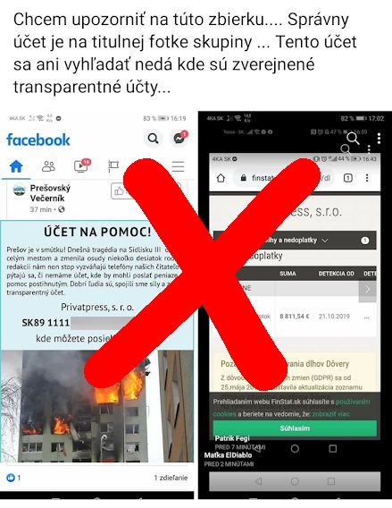 „Je to nepochopiteľné, ale naozaj sa môže nájsť niekto, kto chce využiť nešťastie iných vo svoj prospech. Písali ste nám, že po sociálnych sieťach sa šíria čísla "zaručene" transparentných účtov, ktoré majú slúžiť pre obete prešovskej tragédie,“ upozorňuje polícia. Spolu s mestom odporúčajú všetkým, ktorí chcú pomôcť, aby prispeli na oficiálny účet, ktoré zriadilo mesto Prešov.