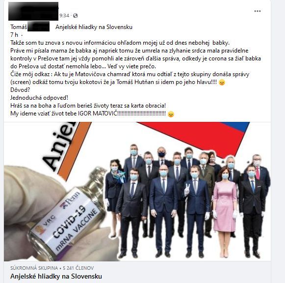 Statusom, ktorý vyšiel v skupine Anjelské hliadky, ktorá je proti očkovaniu aj pandemickým opatreniam, sa už zaoberá polícia.