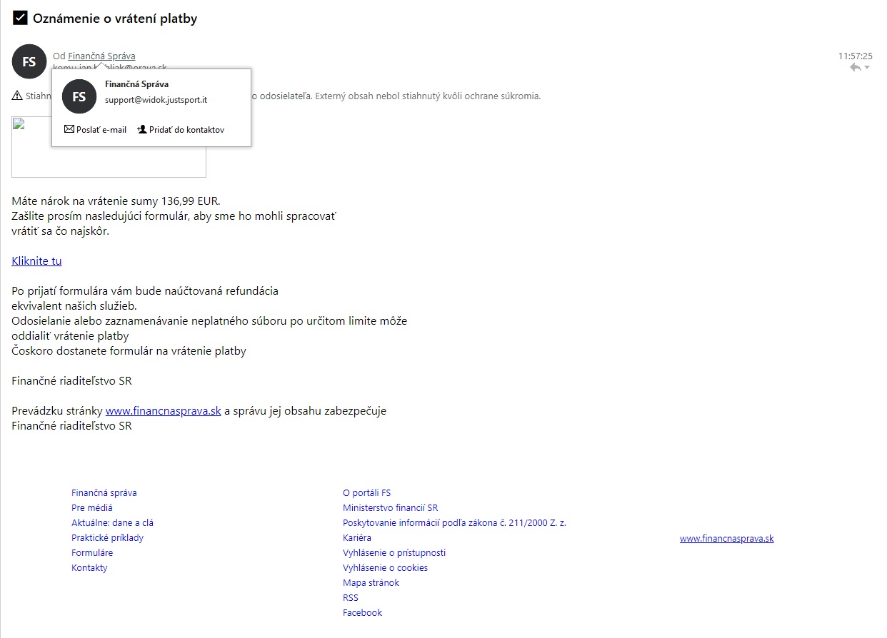 "Jedná sa o rozsiahlu phishingovú kampaň. Skutočným cieľom kampane je vylákať od obete osobné údaje a číslo platobnej karty. Upozorňujeme, že Finančná správa nikdy nevyzývala občanov k aktivite, ktorá je obsahom takejto phishingovej kampane a žiada občanov, aby na takéto e-maily a podvodné praktiky nereagovali," upozorňuje Národné centrum kybernetickej bezpečnosti.