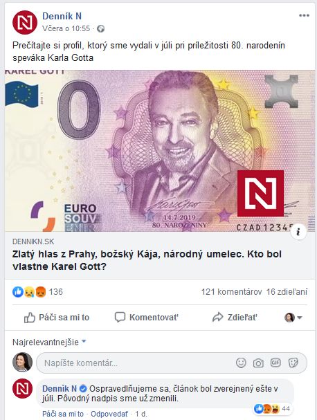 Denník N sa stal terčom mnohých kritických komentárov na sociálnych sieťach aj na webe za titulku staršieho článku, ktorý sa objavil v deň úmrtia na titulke webu Denníka N.