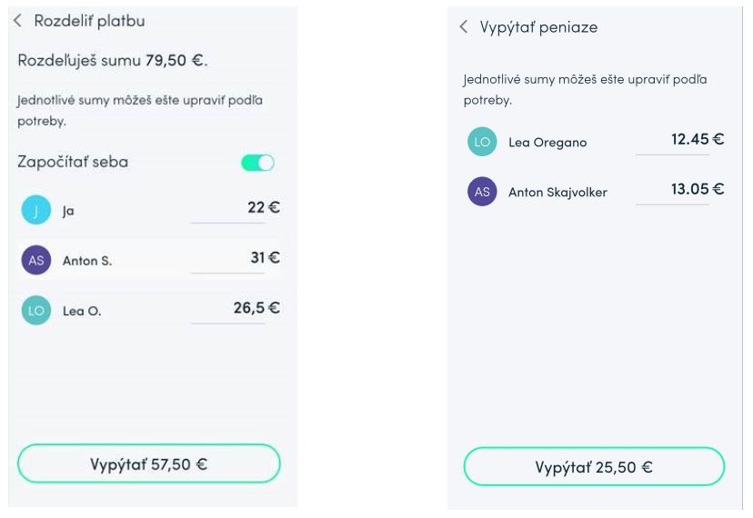 Funkciu „rozdeliť platbu“ použije klient v prípade, že zaplatil za spoločný účet platobnou kartou. V histórii transakcií vyberie platbu a rozdelí ju medzi vybrané kontakty uložené v mobile. Pri platbe v hotovosti vyberie možnosť „vypýtať peniaze“ a postupuje analogicky.