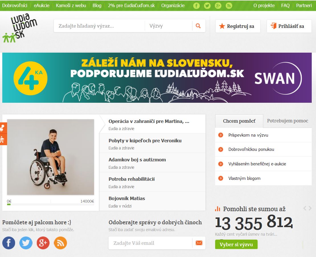 Momentálne je na portáli zaregistrovaných viac ako 1000 aktívnych výziev. Celý finančný príspevok, ktorý sa darca rozhodne venovať v prospech výzvy, putuje konkrétnemu príjemcovi. Strategickými a zároveň najväčšími podporovateľmi portálu i výziev sú spoločnosti SWAN a SWAN Mobile, ktoré financujú projekt už viac ako desať rokov.