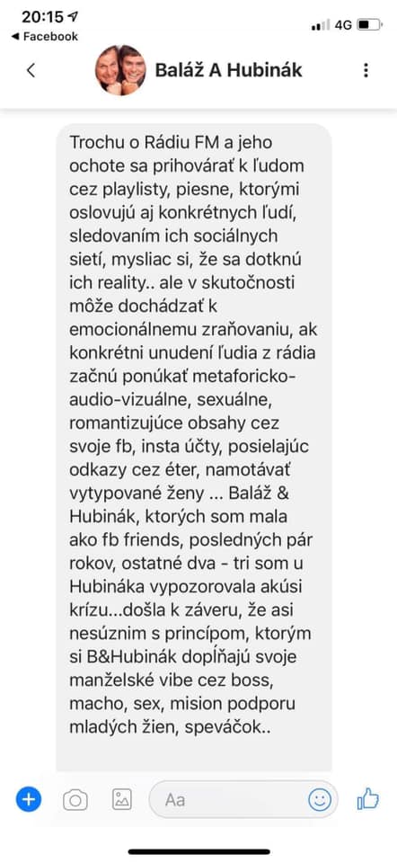 Známa moderátorská dvojica Pavol Hubinák a Daniel Baláž verejne upozorňujú na ženu, ktorá roky obťažuje nielen jedného z nich, ale už aj ich fanúšikov. Nejde pritom len o nevyžiadané správy, ale už aj verejné poškodzovanie mena moderátora, ich relácie s názvom Baláž & Hubinák aj celého Rádia FM.