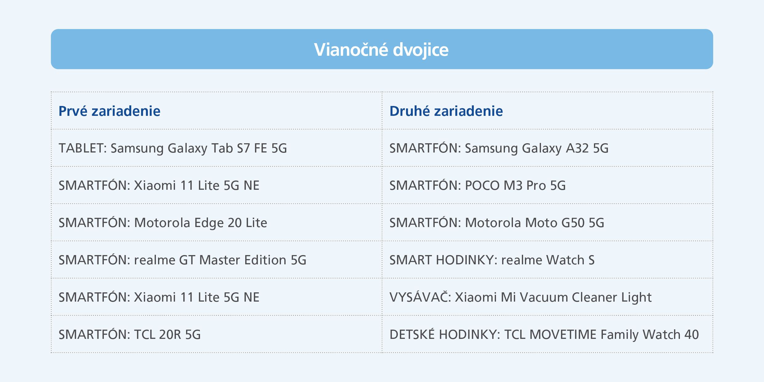 Vianoce v O2 budú v znamení dvojnásobku. Okrem už predstavených dát v O2 SMART Paušáloch pridáva O2 pre zákazníkov aj 6 rôznych kombinácií zariadení, z ktorých si budú môcť svoje vianočné dvojice vybrať na základe vlastných preferencií a želaní. K tabletu si môžu vybrať napríklad smartfón. K smartfónu je možností niekoľko, buď ďalší smartfón, Smart hodinky alebo obľúbený vysávač.
