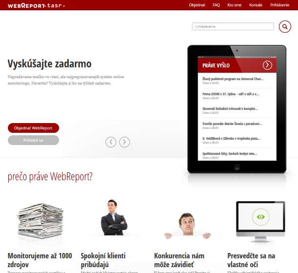 „Ambíciou projektu WebReport.sk je vyplniť medzeru na trhu s monitoringom tlače a poskytnúť klientom informácie, ktoré potrebujú v reálnom čase a v súlade s autorským zákonom," píše TASR v tlačovej správe a ponúka WebReport.sk v septembri na vyskúšanie na týždeň zadarmo.