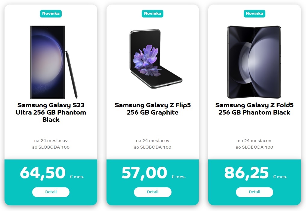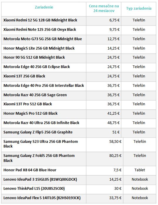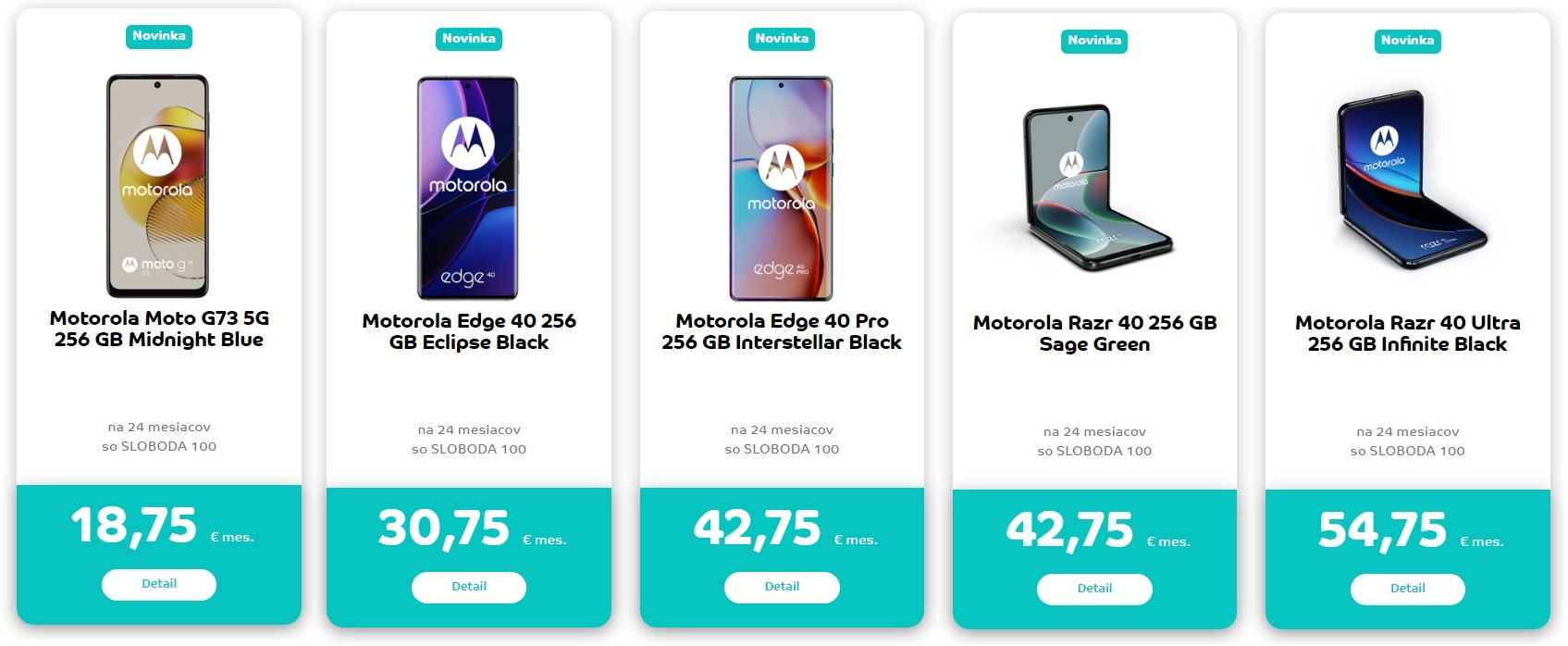V ponuke operátora pribudli bestsellery Xiaomi Redmi 12 5G a Xiaomi Redmi Note 12S a Motorola Moto G73 5G, ktoré ponúkajú za málo peňazí veľa muziky. Okrem toho operátor pridal aj prémiové modely Samsung, Xiaomi a Motorola. Od Samsungu sú dostupné TOP modely Samsung Galaxy Z Flip5, Samsung Galaxy S23 Ultra a Samsung Galaxy Z Fold5. Za zmienku stoja aj najnovšie modely čínskeho výrobcu Xiaomi 13T a Xiaomi 13T Pro, ktoré poskytujú maximálny výkon a výbavu vlajkovej lode. Medzi TOP telefóny v ponuke operátora jednoznačne patria aj smartfóny – nadupaná Motorola Edge 40 a skladacie „véčka“ Motorola Razr 40 a Motorola Razr 40 Ultra.