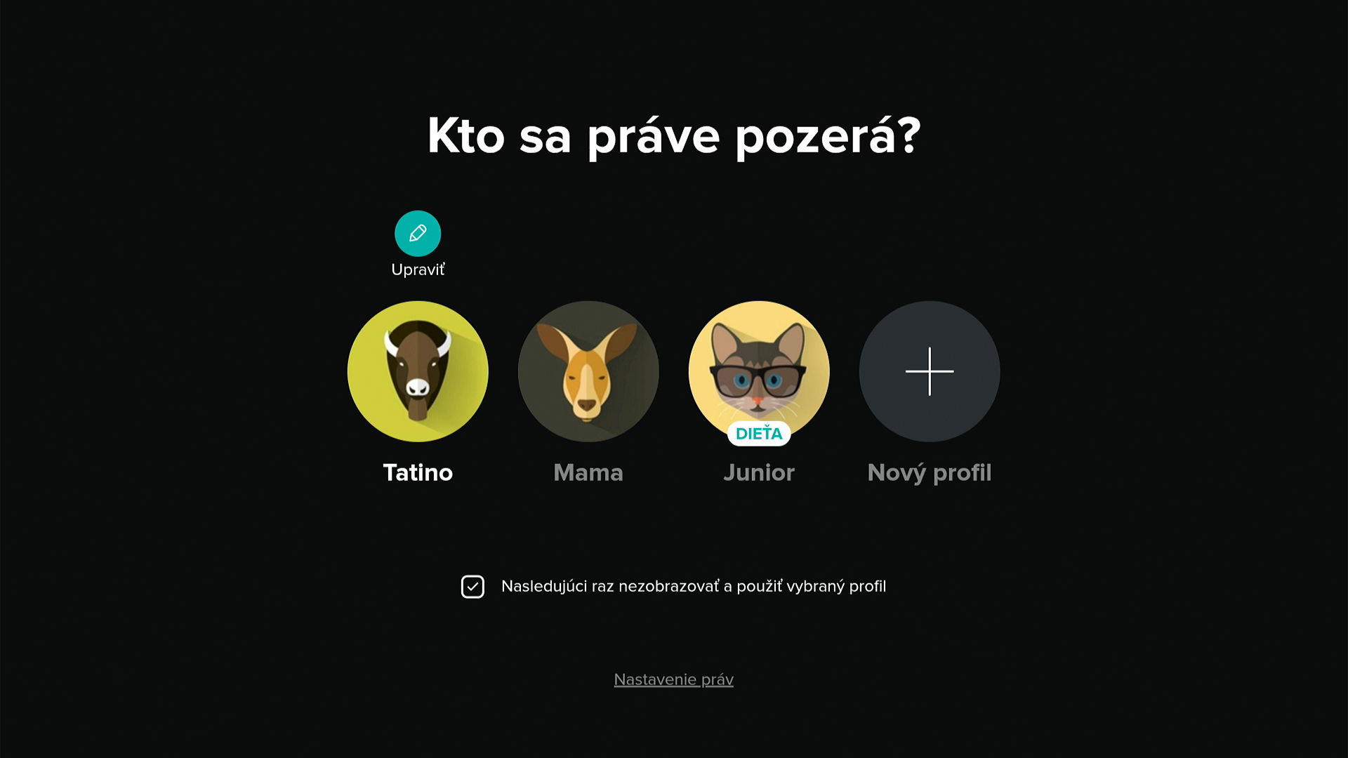 Televízne profily ponúkajú personalizovaný zážitok v rámci jedného predplatného. Zákazníci si môžu vytvoriť individuálne profily, nastaviť vlastné zoznamy relácií a prispôsobiť si zobrazovaný obsah. Divák tak vidí výlučne svoje rozpozerané relácie, obľúbené stanice a odporúčania na mieru. Pokračuje v sledovaní tam, kde prestal, má k dispozícii vlastné nastavenia a prístup len k svojim nahrávkam, ktoré ostatní členovia domácnosti nevidia ani nemôžu omylom vymazať. Rodičia môžu vytvoriť detské profily s obmedzeným obsahom a chrániť ich PIN kódom – pre väčšiu bezpečnosť a pokoj pri používaní služby.
