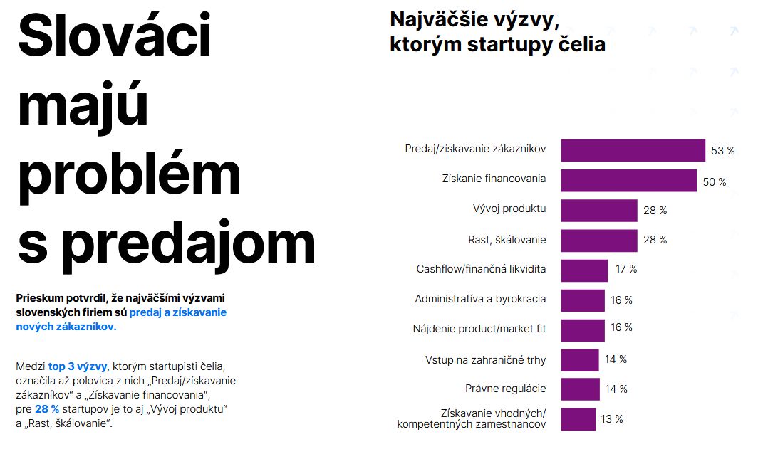 Prieskum ukazuje, že najväčšou výzvou pre slovenské startupy je predaj a získavanie zákazníkov (53 % označilo medzi top 3 výzvy). Prekážkou je aj získavanie financovania (50 %) a rast či škálovanie (28 %). Výzvou je aj nábor technických a obchodných pozícií, kde startupy zápasia s nedostatkom talentovaných ľudí a konkurenciou veľkých firiem.