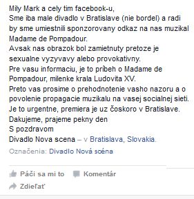 Divadlo Nová scéna sa v týchto dňoch snaží propagovať aj na Facebooku pripravovaný muzikál Madame de Pompadour. V projekte sa objavia napríklad Štefan Skrúcaný, Jozef Vajda, Maroš Kramár, Ján Slezák. Madam de Pompadour stvárni speváčka Sisa Sklovská. Práve jej fotku s hlbokým výstrihom Facebook nestrávil.