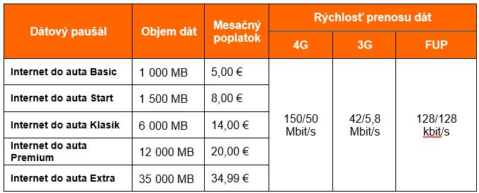 Orange novú službu Internet do auta spúšťa s piatimi dátovými paušálmi s objemom predplatených dát od 1 000 do 35 000 MB s mesačným poplatkom od 5 do 34,99 eur vrátane DPH. Rýchlosť prenesených dát v 4G sieti dosahuje 150/50 Mbit/s. Podrobnejšie informácie sú uvedené v tabuľke: