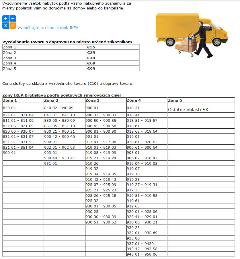Ceny za vyzdvyhnutie tovaru a doručenie sa pohybujú v rozmedzí od 35 do 99 eur podľa miesta doručenia.
