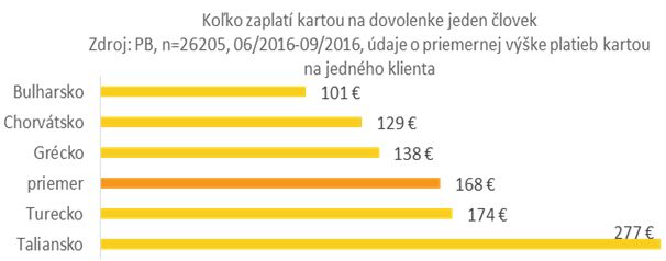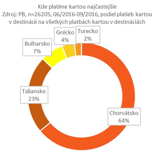Dominanciu Chorvátska, ako jednoznačne najobľúbenejšej destinácie, potvrdzuje aj počet platieb kartou v zahraničí. Vyše šesť z desiatich (64 %) platieb v sledovaných krajinách skončilo práve v perle Jadranu. Takmer štvrtina (23 %) v Taliansku. Hodnota jednej takejto platby je v priemere 37 eur. Najviac nás jeden nákup vyjde v Taliansku (40 eur) a najmenej v Bulharsku (27 eur).