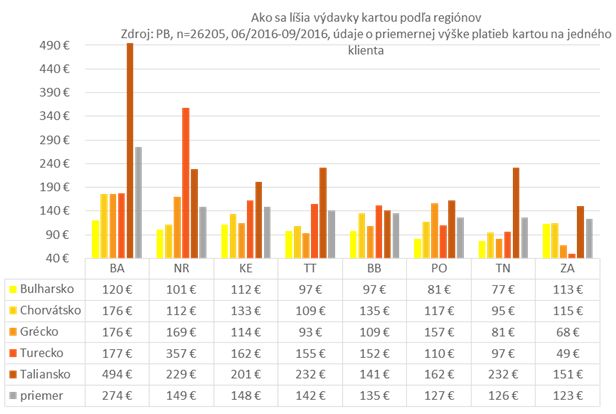 Výdavky v zahraničí sa výrazne líšia aj podľa toho, odkiaľ dovolenkár pochádza. Jednoznačne najviac platia kartou ľudia z Bratislavského kraja. V priemere urobí jeden Bratislavčan počas dovolenky platby kartou za 274 eur. Rekordéri boli vlani bratislavskí návštevníci Talianska, ktorí minuli takmer 500 eur „na hlavu". Naopak, najviac vedia na dodatočných výdavkoch na dovolenke ušetriť Žilinčania. V priemere jeden z nich minul kartou 123 eur. V Turecku dokonca ani nie 50 eur. „V Turecku sú obľúbené dovolenky all inclusive. Mnohí dovolenkári zároveň zostávajú v hotelových rezortoch a preto majú prirodzene nižšie dodatočné náklady," uvažuje Žáčková.