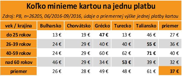 Dovolenku, teda ubytovanie, dopravu a stravu, väčšinou platíme vopred. Poštová banka sa pozrela na to, aké ďalšie výdavky zvykneme mať v obľúbených destináciách. Analyzovala vyše 26 tisíc platieb kartou počas vlaňajšieho leta. „Na dovolenky v zahraničí si berieme čoraz menej hotovosti a spoliehame sa na platobnú kartu. Platíme ňou zážitky, darčeky, potraviny či dodatočné poplatky," komentuje hovorkyňa Poštovej banky Lýdia Žáčková. Z analýzy vyplynulo, že jeden dovolenkár urobí v priemere štyri platby a minie 168 eur. Najmenej, 101 eur, stoja dovolenkové výdavky platené kartou v Bulharsku. Najdrahšie nákupy si doprajeme v Taliansku. Minieme tam 1,5-násobne viac oproti priemeru, 277 eur.