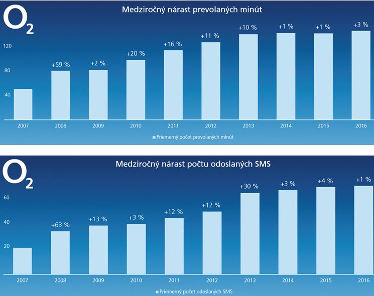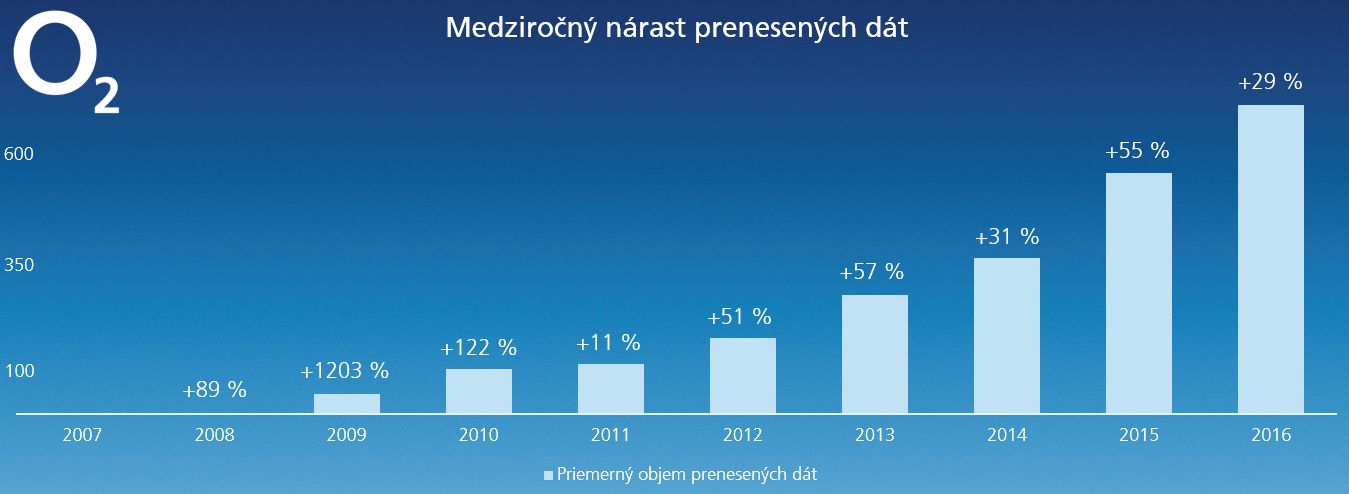Prirodzene najvýraznejším bol nárast využívania dát cez telefón, kde je krivka rastu exponenciálna. V roku 2007 sa priemerná spotreba pohybovala v jednotkách prenesených MB, čo zodpovedalo vtedajším technickým možnostiam. Logicky najvýraznejším rastom dátovej prevádzky bol štart dátových služieb aj na predplatených kartách. V roku 2009 vzrástla dátová prevádzka zákazníkov až o 1203 %. V súčasnosti prenesie v priemere O2 zákazník okolo sedem stoviek MB mesačne. „Nárast dátovej prevádzky je veľmi intenzívny. Rast dopytu po službách je vždy pozitívnou správou a my sa na túto situáciu zodpovedne pripravujeme masívnymi investíciami do 4G siete. Okrem toho sme na zvýšenú potrebu dát zareagovali ponukou čisto dátových paušálov O2 Dáta vo februári 2017 zacielených na tzv. datacentrických užívateľov," dopĺňa Igor Tóth.