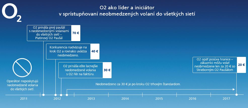 Kým pri vstupe O2 na trh v roku 2007 neexistovala ponuka neobmedzených volaní pre zákazníkov, dnes už operátori ponúkajú túto službu vo viacerých programoch v rôznych cenových úrovniach. Po prvýkrát prinieslo neobmedzené volania v rámci programu práve O2, keď v roku 2012 predstavilo Platinový O2 Paušál. Ďalším míľnikom boli neobmedzené volania pre program O2 Fér v podobe balíčka, po ktorom zavedení sa cenovka „flatu" ustálila na hladine 30 eur. Od začiatku septembra O2 opäť posunulo cenovku neobmedzených volaní, a to na novú úroveň 20 eur, keď predstavilo svoj vylepšený Strieborný O2 Paušál. „Mnoho zákazníkov si stále pamätá pocit, kedy sa pri telefonovaní museli kvôli cene obmedzovať. Neobmedzené volania prinášajú slobodu a veľký komfort. Pri cenovke 20 eur sa navyše stávajú masovo dostupné. Kým v minulosti stál tento komfort 70 eur mesačne, dnes sme pokorili hranicu, o ktorej sme v minulosti mohli len snívať. Cena 20 eur je malou revolúciou na našom trhu," hovorí Igor Tóth. V júni 2017 tiež O2 prišlo s ponukou jednotnej ceny za hovor 0,1 eur na predplatnej karte O2 Voľnosť a prinieslo tak revolúciu aj na trh predplatených kariet.