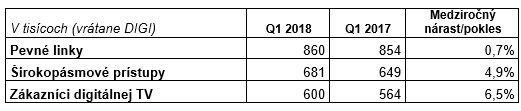 Skupina Slovak Telekom má za sebou úspešný prvý kvartál 2018. Medzi najväčšie úspechy patrí: dosiahnutie nového míľniku 600 tisíc TV zákazníkov, počet širokopásmových prístupov rástol na 681 tisíc, už šiesty kvartál po sebe rastie počet pevných liniek.