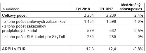 K 31.3.2018 využívalo služby mobilnej siete Telekom 2 284 tisíc zákazníkov. Za prvý kvartál sa zvýšila báza o 41 tisíc zákazníkov, čo je výborný výsledok a medziročne stúpla báza dokonca o 54 tisíc zákazníkov.