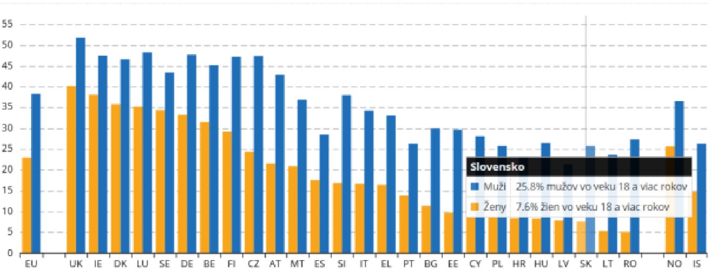 Pri tejto príležitosti sme sa pozreli na konzumáciu alkoholu a cigariet doma, aj v ostatných krajinách Európskej únie. Podľa údajov Eurostatu tu existujú veľké rozdiely tak medzi pohlaviami, ako aj medzi jednotlivými členskými štátmi. Alkoholické nápoje chutia viac mužom. „V rámci EÚ ich konzumuje každý týždeň, ale nie na dennej báze, až 38 % chlapov a 23 % žien starších ako 18 rokov. Spomedzi krajín Únie sa podiely mužov pohybujú od 21 % v Lotyšsku do 52 % v Spojenom kráľovstve a žien od 5 % v Rumunsku a Litve do 40 % v Spojenom kráľovstve,“ uvádza Jana Glasová, analytička Poštovej banky. Slovensko sa v rámci tohto prieskumu umiestnilo medzi krajinami s nižšou týždennou konzumáciou alkoholu. Drink si každý týždeň dopraje 25,8 % mužov a 7,6 % žien. Medzi lídrov v tomto rebríčku, po Británii, patrí Írsko, Dánsko, Luxembursko, Švédsko a Nemecko, ale aj Česká republika (47,4 % mužov, 24,4 % žien).
