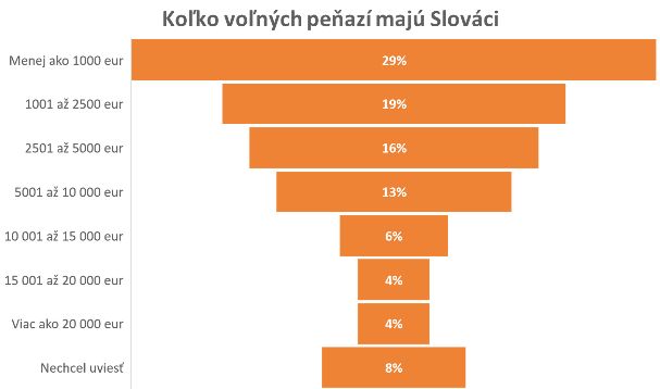 Takmer polovica – až 48 % ľudí - má k dispozícii voľné peňažné prostriedky vo výške menšej ako 2 500 eur. Vyplýva to z prieskumu, ktorý si dala spraviť Prvá penzijná správcovská spoločnosť Poštovej banky (PPSS) začiatkom leta 2019.