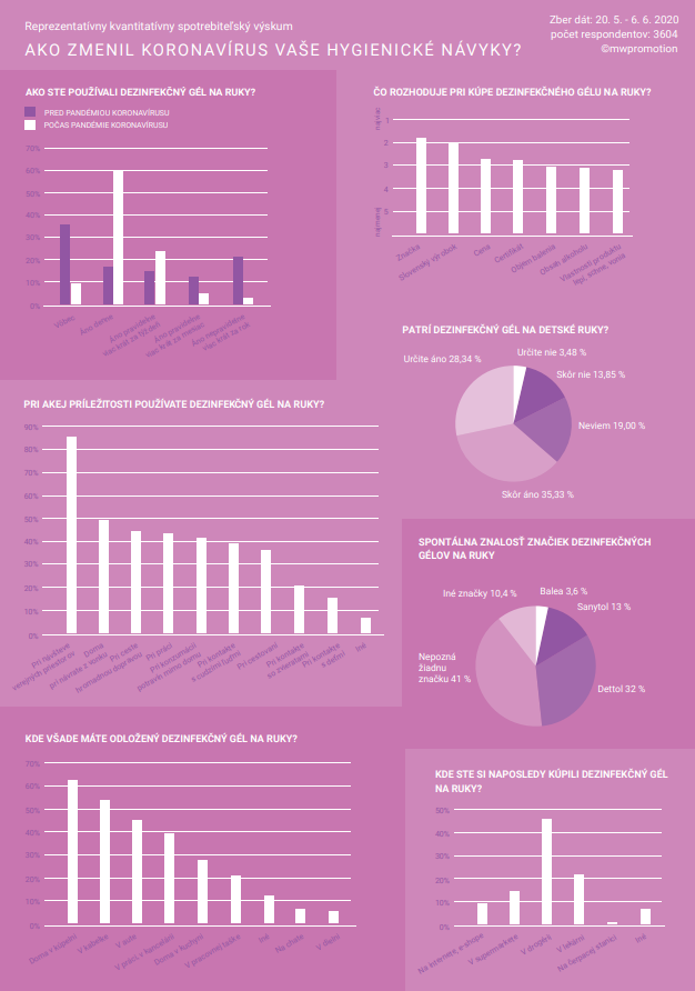 Pred pandémiou používalo bezoplachový dezinfekčný gél na ruky na dennej báze iba 17% respondentov. Počas pandémie až 60%. To je nárast o viac ako 250%. Názor na používanie dezinfekčného gélu deťmi je pomerne jednoznačný. 64% respondentov bolo za a 17% proti. Tri najdôležitejšie faktory pri kúpe dezinfekčného gélu na ruky sú: značka, produkt vyrobený na Slovensku a cena.
