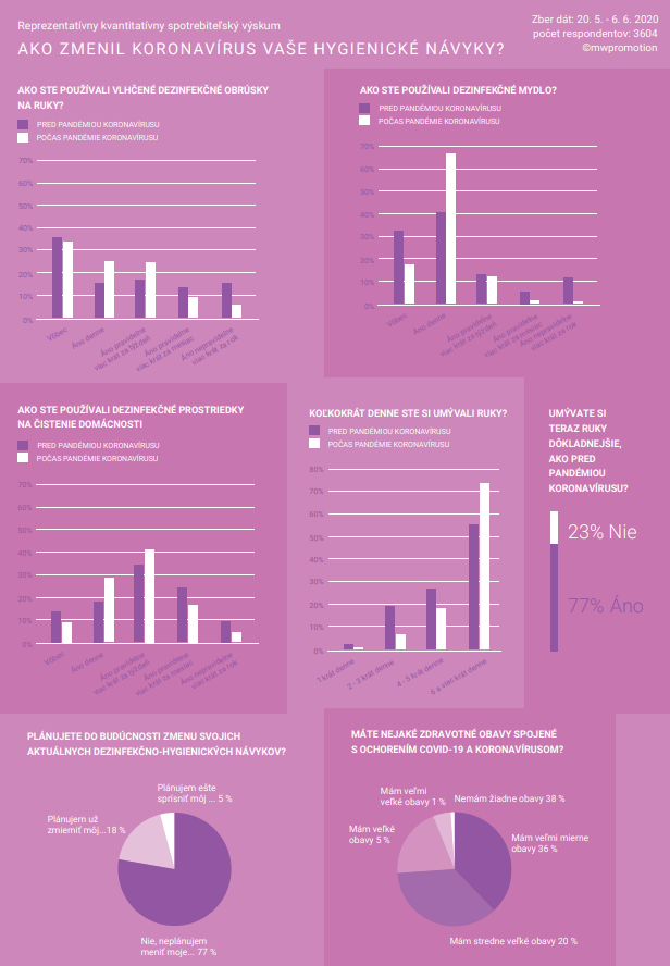 Agentúra MW Promotion zorganizovala spotrebiteľský výskum o zmene hygienických návykov počas pandémie koronavírusu. Viac ako 3.600 respondentov odpovedalo na otázky ohľadne ich hygienických zvyklostí pred a počas pandemickej krízy. Zmeny hygienického správania populácie boli zásadné.