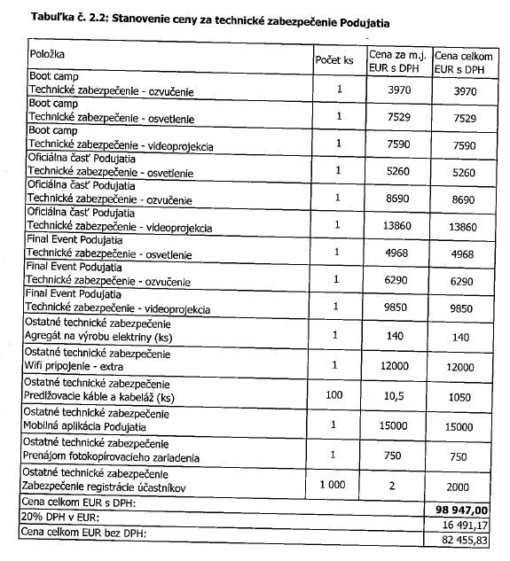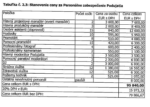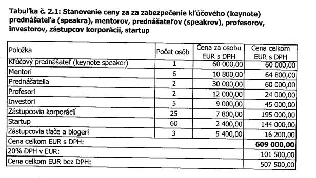 Zaujímavé sú ceny pre prednášajúcich. Hlavný prednášajúci dostane 60 tisíc eur. Mentori po 10 800, prednášatelia po 30 tisíc eur. 600 tisíc zaplatí štát len za pozvaných hostí. Zoznam rečníkov si môžte pozrieť tu. Len za wifi sa zaplatí 12 tisíc. Pre troch blogerov 16 200 eur.