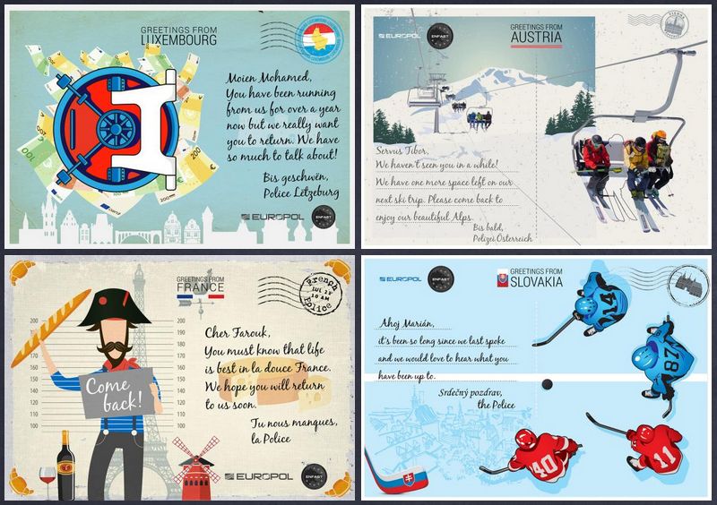 Pohľadnice, ktoré sú určené hľadaným ľuďom, sú súčasťou letnej kampane Europolu a Európskej siete pracovísk cieľového pátrania (ENFAST) zameranej na pátranie po najväčších zločincoch. Virtuálne pohľadnice rozosielajú polície všetkých členských štátov EÚ.