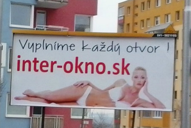 V rozpore s etickým kódexom je aj billboard „Vyplníme každý otvor" od zadávateľa: INTER-OKNO. Podľa komisie využitie zobrazenia ženského tela nemá žiaden súvis s propagovaným tovarom, ktorým sú plastové okná a príslušenstvo. „Zobrazenie je samoúčelné, bez opodstatnenia a súvisu s posolstvom reklamy... Takáto forma reklamnej komunikácie je sexistická a to ako v obrazovej, tak aj vo verbálnej rovine a nemožno ju považovať za etickú. Reklamný text „Vyplníme každý otvor!", ktorý je s ohľadom na celkový vizuál reklamy možné vnímať ako dvojzmyselný a porušujúci všeobecné normy mravnosti a slušnosti," píše komisia v rozhodnutí.