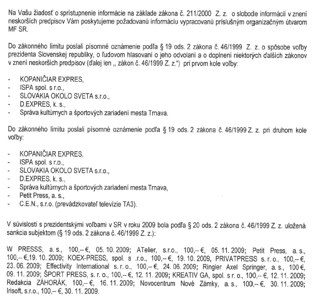 TIS si vyžiadala od ministerstva financií informáciu, ktoré médiá si splnili zákonnú povinnosť o oznámili výšku prostriedkov vynaložených jednotlivými kandidátmi na funkciu prezidenta na propagáciu a akú pokutu za nesplnenie povinnosti v minulosti dostali.