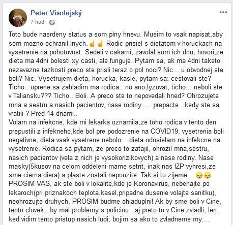 Peter Visolajský, pediater z Nitry, mal v noci zo soboty na nedeľu službu na pohotovosti. Stretol sa s takýmto nezodpovedným prístupom otca chorého dieťaťa, na ktorý upozornil na facebooku: