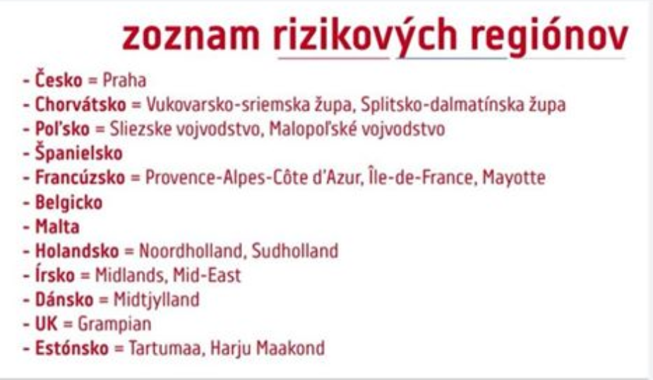Rizikové regióny v menej rizikových krajinách budú v dohľadnom čase vyšpecifikované na stránkach Ministerstva zahraničných vecí a európskych záležitostí SR, Ministerstva zdravotníctva SR a Úradu verejného zdravotníctva SR. Priebežný zoznam si zatiaľ môžete pozrieť v grafike nižšie.