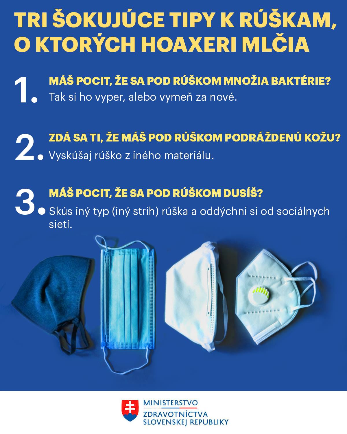 "Zopakujme si to ešte raz: rúška sú jednoduchý a lacný nástroj v boji proti koronavírusu, ktorý nám možno berie kúsok komfortu, ale umožňuje nám veľmi efektívne chrániť seba a naše okolie. Máločo má lepší pomer cena/výkon v tejto pandémii, ako práve nosenie rúšok," píše na facebooku ministerstvo.