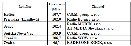 Zoznam všetkých frekvencií a žiadateľov jarného výberového konania: