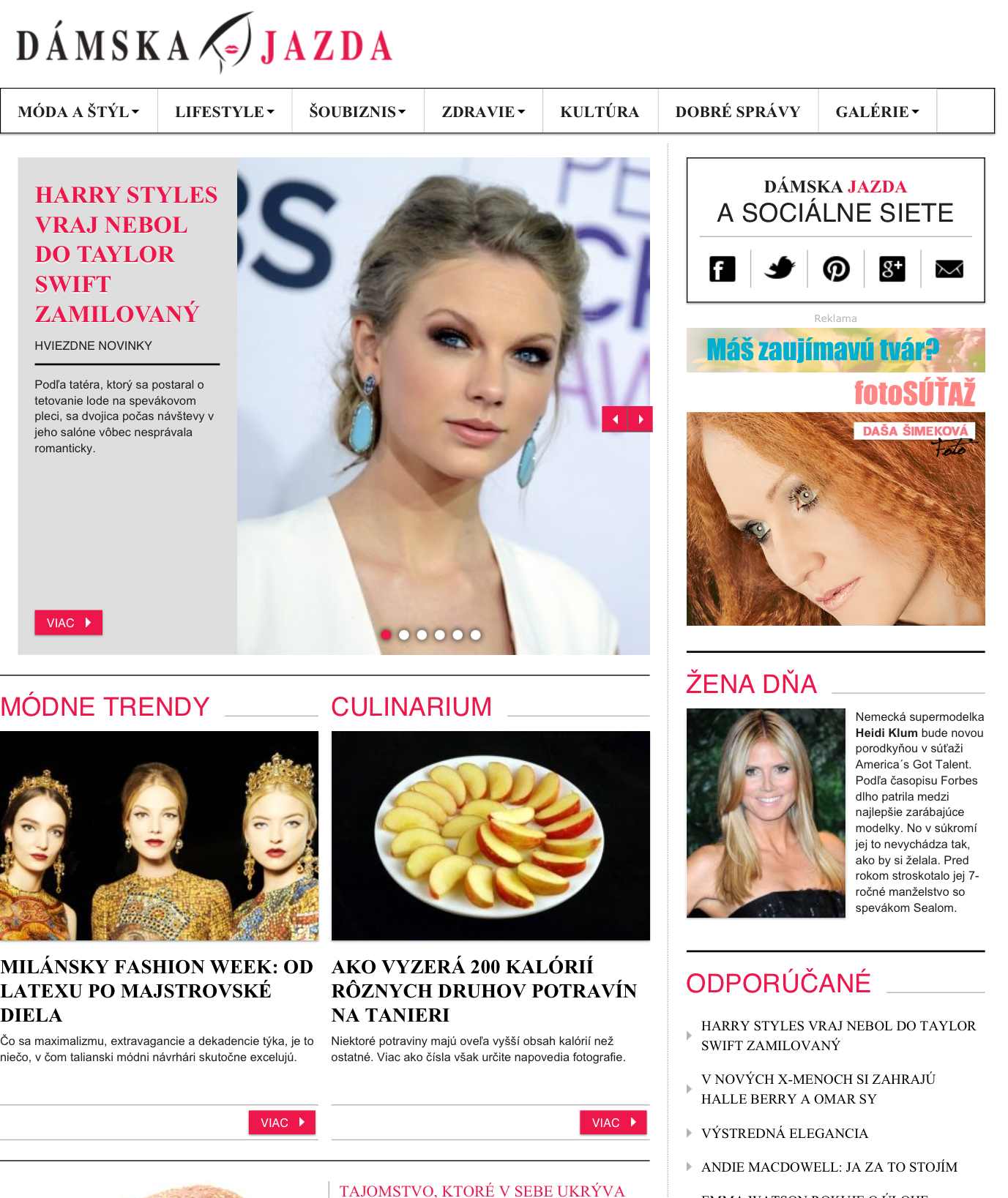 Magazín pre ženy Dámskajazda.sk prinesie novinky a trendy zo sveta módy, kozmetiky, zdravia, šoubiznisu a životného štýlu. na stránke má aj horoskop, fotogalérie z aktuálnych módnych a šoubiznisových udalostí, ankety a súťaže.