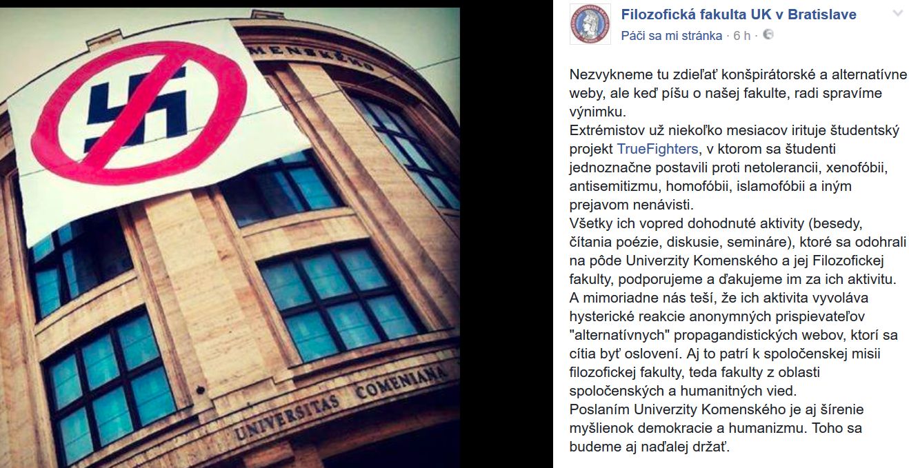 Filozofická fakulta UK v Bratislave sa na facebooku postavila za svojich študentov zoskupených v projekte TrueFighters, ktorí svojským spôsobom bojujú proti mýtom, dezinformáciám, netolerancii a nenávisti.