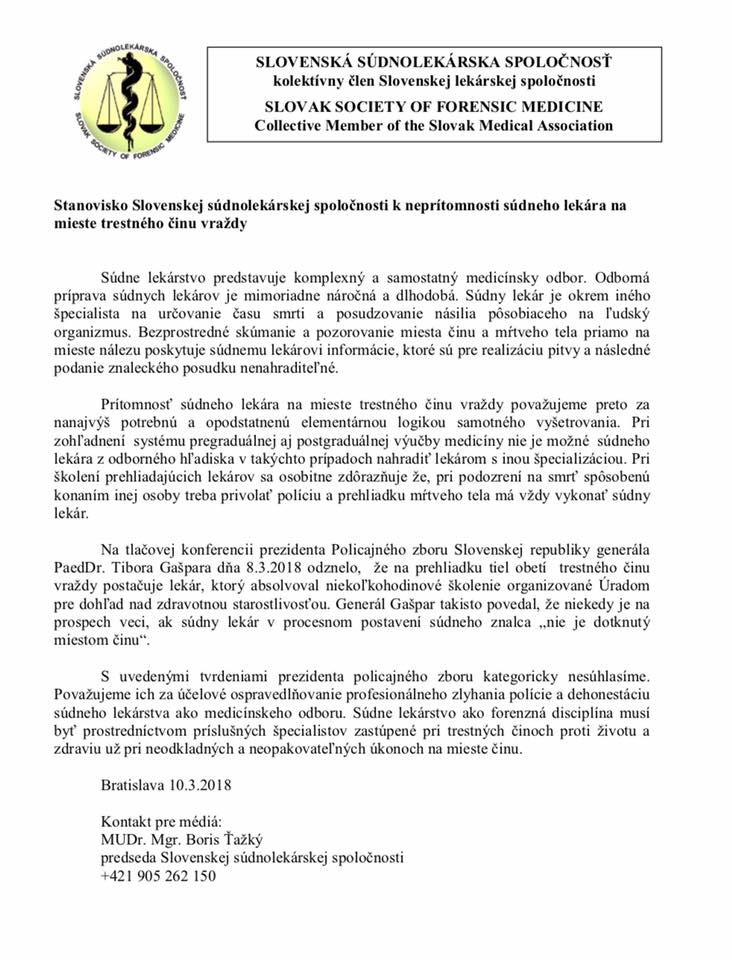 "Prítomnosť súdneho lekára na mieste trestného činu vraždy považujeme za nanajvýš potrebnú a dôvodnú elementárnu logikou samotného vyšetrovania," uviedol predseda SLS Boris Ťažký.