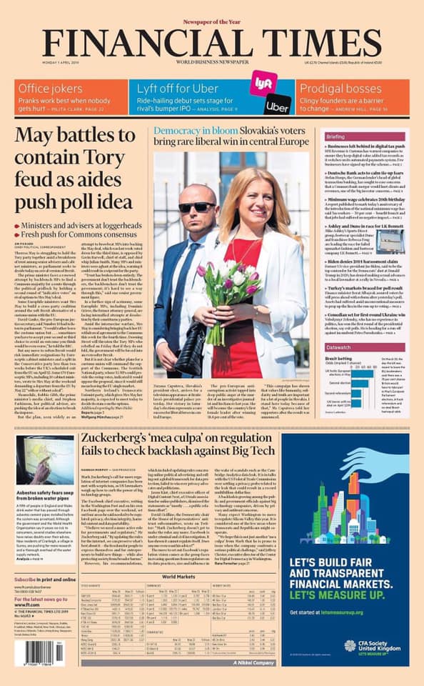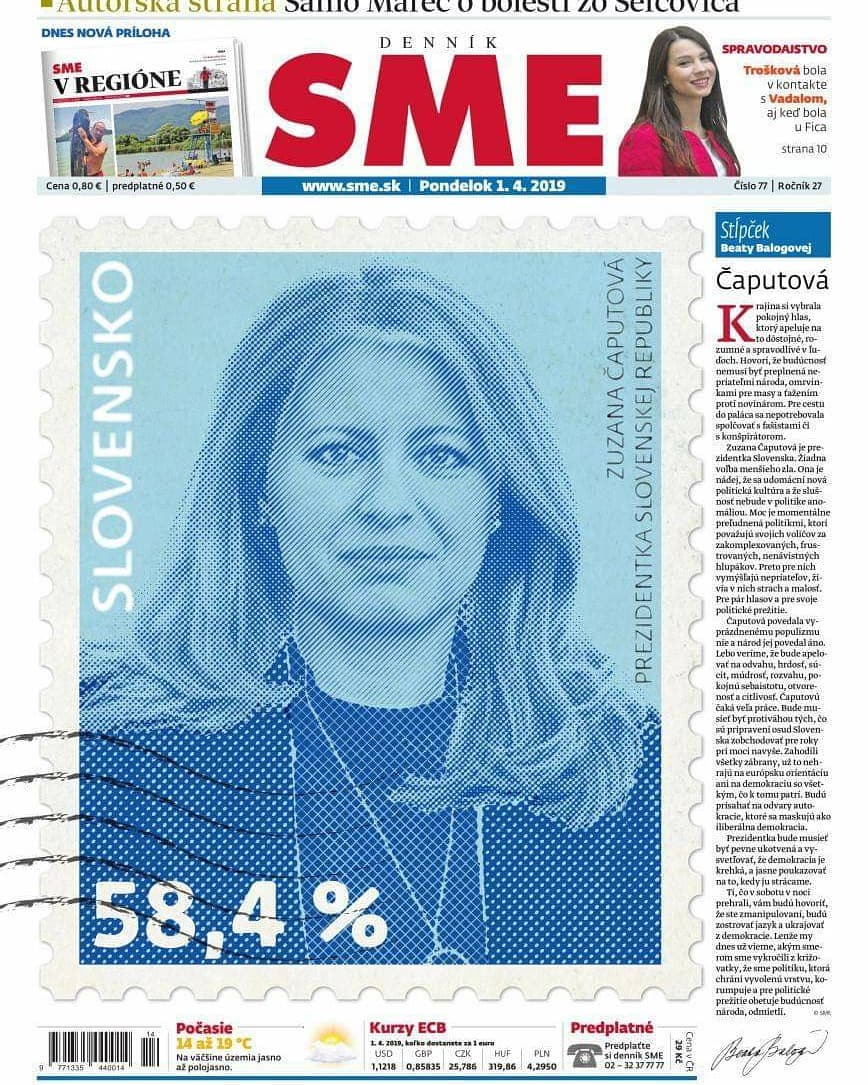 Fotka Zuzany Čaputovej, ktorá je víťazkou prezidentských volieb na Slovensku, sa objavila na titulke všetkých dnešných denníkov na Slovensku, ale aj veľkej časti v ČR, ba dokonca zaujala aj prestížny magazín FT.
