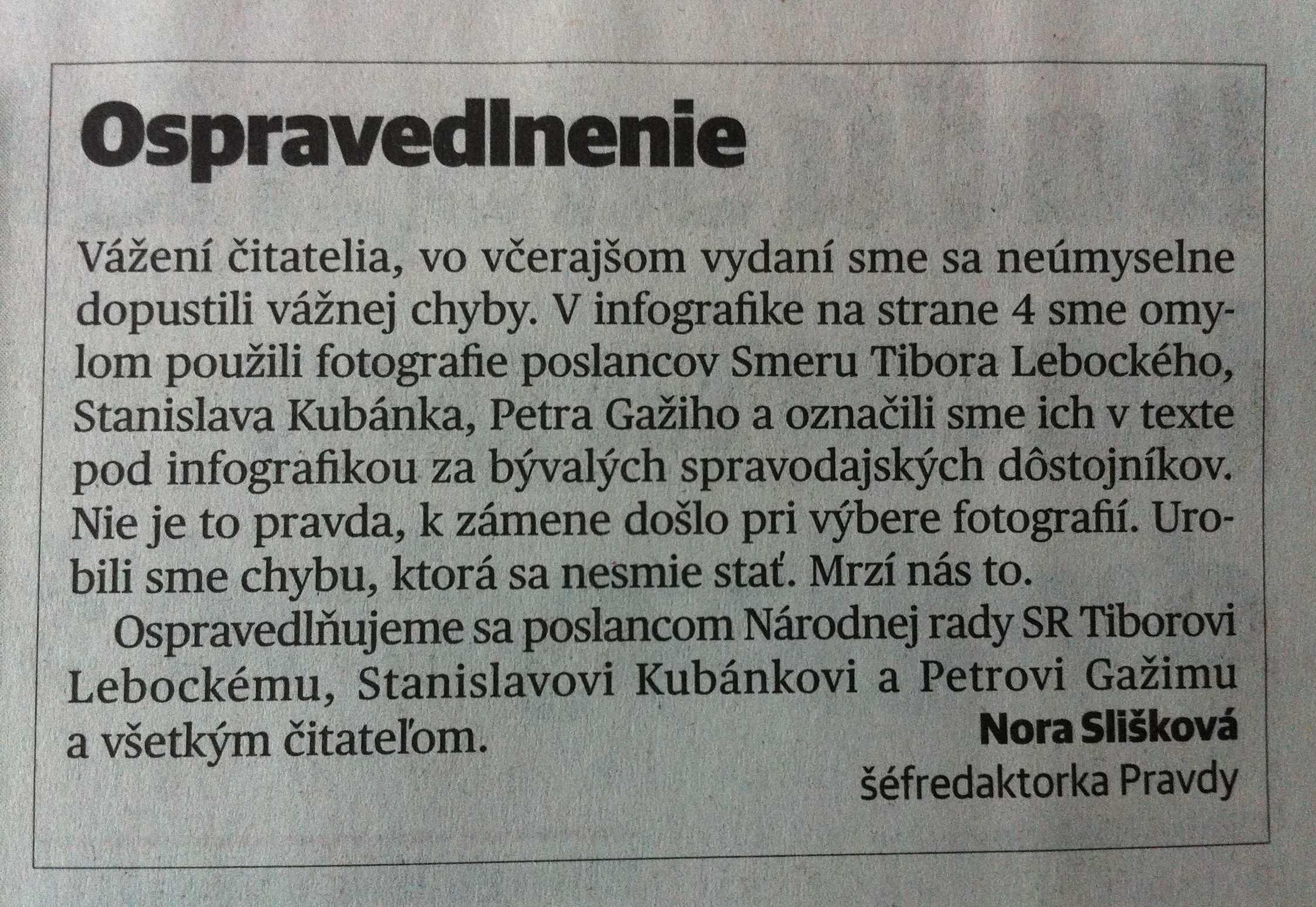 Denník Pravda dnes zverejnil ospravedlnenie za včerajší článok o nových tajných agentoch, ku ktorému pripojil infografiku s fotografiami troch poslancov Smeru.