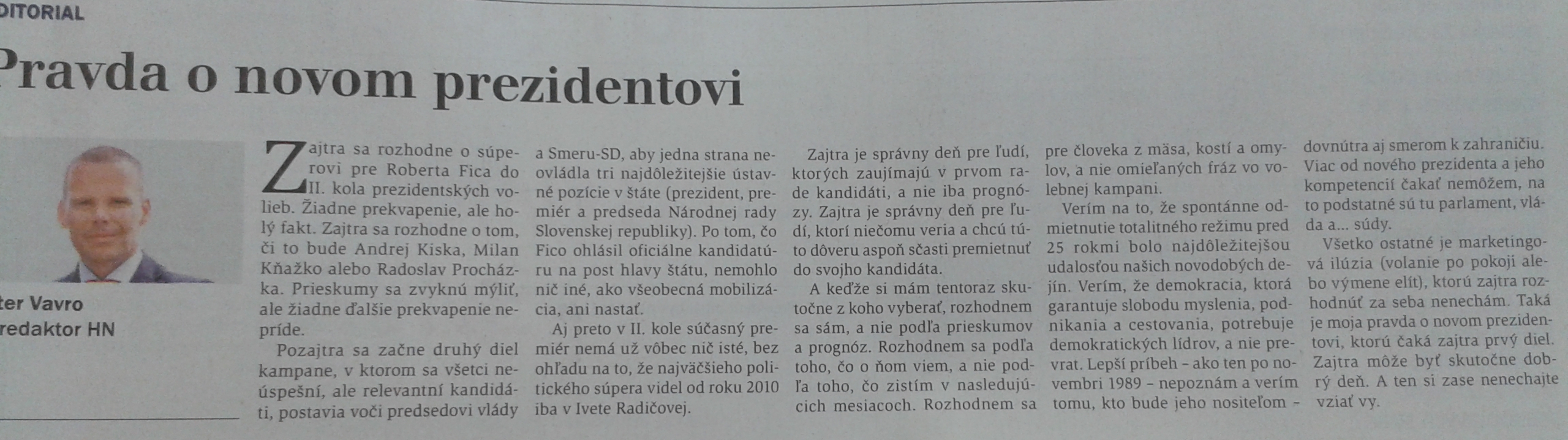 Dnes (v piatok) šéfredaktor Hospodárskych novín Peter Vavro napísal editoriál s názvom Pravda o novom prezidentovi, v ňom síce komkrétne meno, koho bude voliť, nevyslovil, ale dal indície. „A keďže si mám tentoraz skutočne z koho vyberať, rozhodnem sa sám, a nie podľa prieskumov a prognóz. Rozhodnem sa podľa toho, čo o ňom viem, a nie podľa toho, čo zistím v nasledujúcich mesiacoch. Rozhodnem sa pre človeka z mäsa, kostí a omylov, a nie omieľaných fráz vo volebnej kampani.... Verím, že demokracia, ktorá garantuje slobodu myslenia, podnikania a cestovania, potrebuje demokratických lídrov, a nie prevrat.... Všetko ostatné je marketingová ilúzia (volanie po pokoji alebo výmene elít), ktorú zajtra rozhodnúť za seba nenechám. Taká je moja pravda o novom prezidentovi, ktorú čaká zajtra prvý diel.," napísal Vavro.