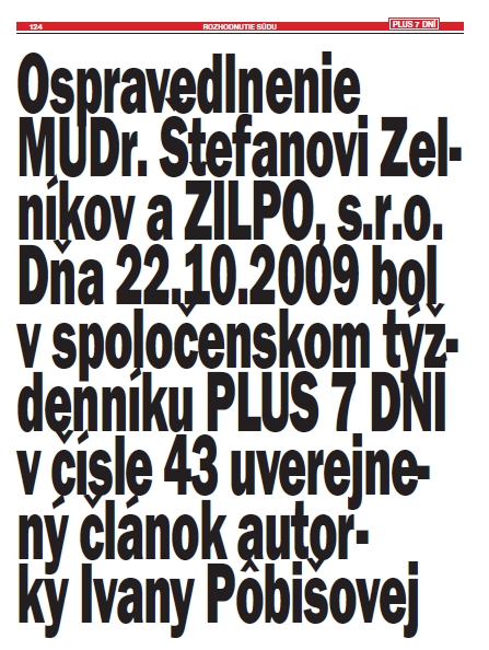 Týždenník Plus 7 dní vyšiel v neobvyklej forme. Na 52 stranách je zverejnené ospravedlnenie niekdajšiemu poslancovi SNS Štefanovi Zelníkovi, o ktorom rozhodol súd.