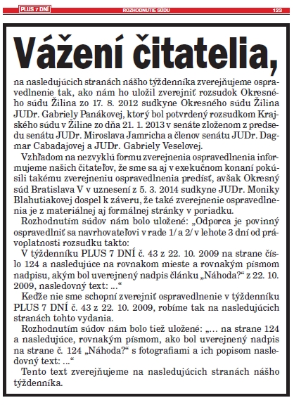 Ospravedlnenie uložil zverejniť rozsudok Okresného súdu Žilina zo 17. 8. 2012 , ktorý bol následne potvrdený rozsudkom Krajského súdu v Žiline z januára minulého roka. Týždenník sa v exekučnom konaní pokúsil takému zverejneniu ospravedlnenia predísť, avšak Okresný súd Bratislava V dospel k záveru, že také zverejnenie ospravedlnenia je z materiálnej aj formálnej stránky v poriadku, píše týždenník.