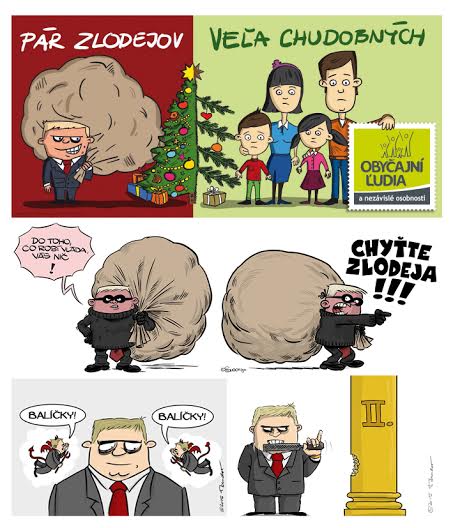 OĽaNO má po celom Slovensku nové bilbordy s karikatúrou. a názvom "Pár zlodejov, veľa chudobných." Vďaka bilbordu je za zlodeja dnes označovaná aj samotná strana OĽaNO.