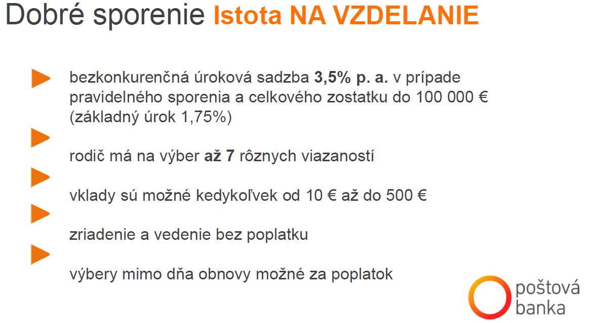 Každý rodič chce pre svoje dieťa len to najlepšie a pri investovaní do vzdelania to platí dvojnásobne. Nad budúcnosťou svojho dieťaťa je však dôležité zamýšľať sa systematicky už od jeho narodenia. „Napríklad najneskôr vo veku štyroch rokov je ideálne začať dieťa učiť cudzí jazyk, približne v 14-tich rokoch postupne profilovať jeho špecializáciu s ohľadom na budúce povolanie, v 18-tich ho pripravovať na prijímacie skúšky na vysokej škole,“ hovorí Lýdia Žáčková, hovorkyňa Poštovej banky, a dodáva: „Na financovanie budúceho štúdia je však najlepšie myslieť hneď po narodení. Pri dlhodobom plánovaní môže byť aj štúdium na prestížnej univerzite v zahraničí pre každého realitou.“